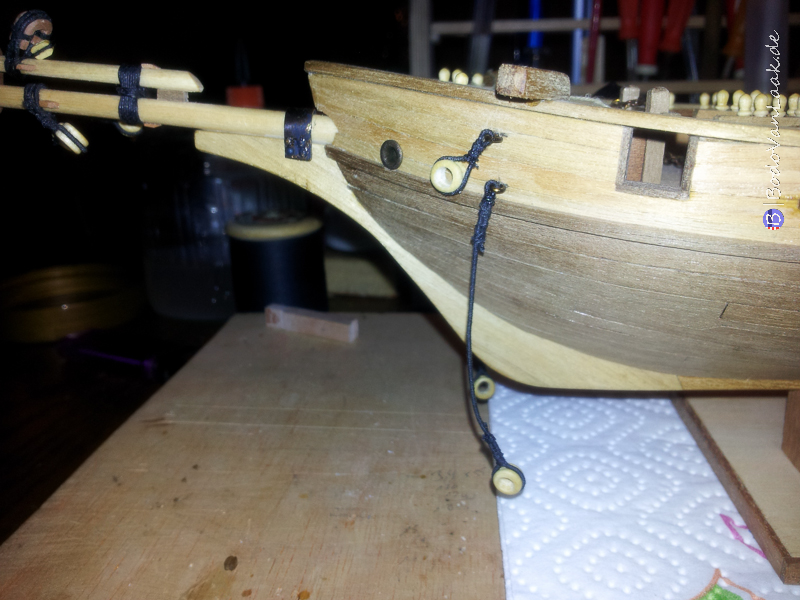 (anstroppen von Blöcken, Bohrungen anfertigen etc.) fertigstellen, bevor der Bugspriet und der Klüverbaum am Rumpf montiert