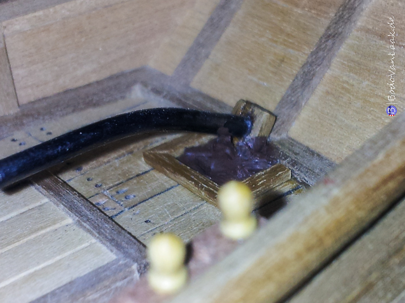 Beides habe ich nocheinmal durch die Anbringung weiterer Teile verändert. Der Bugspriet kommt nun auf dem Deck in einer hölzernen Halterung zu Ruhen.